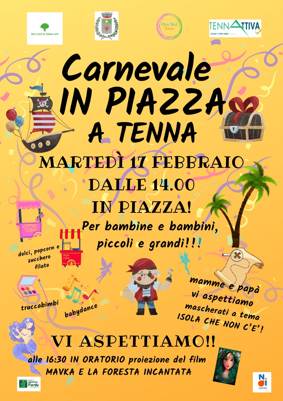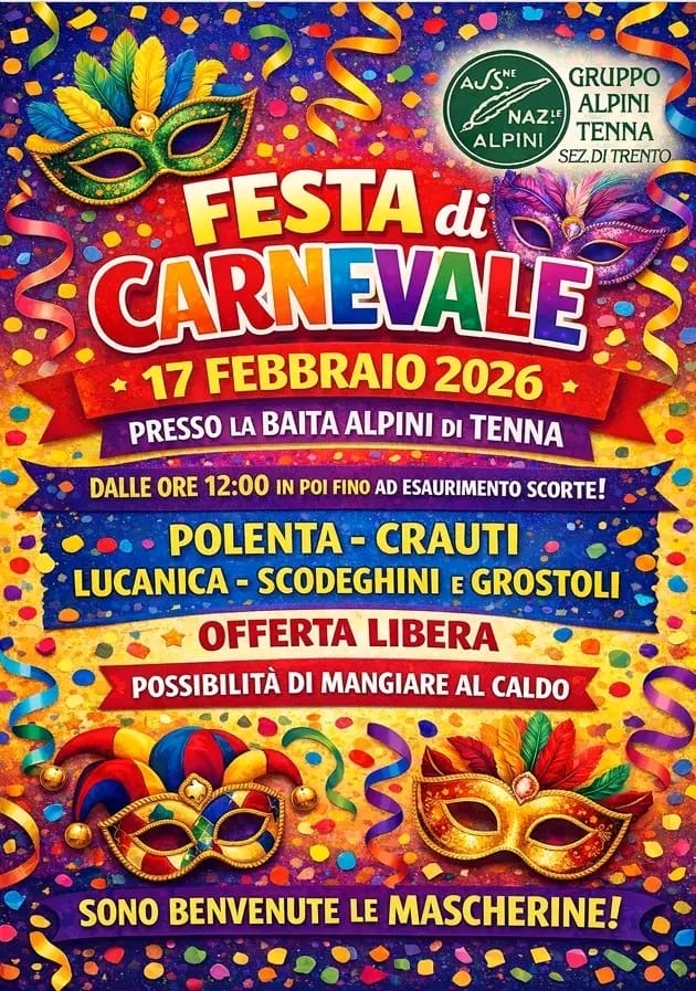 Descrizione il giorno 17 febbraio 2026 dalle ore 12.00 presso baita degli alpini dalle 14.00 in piazza - ore 16.30 in oratorio proiezione del film: Mavka e la foresta incantata Carnevale in Piazza